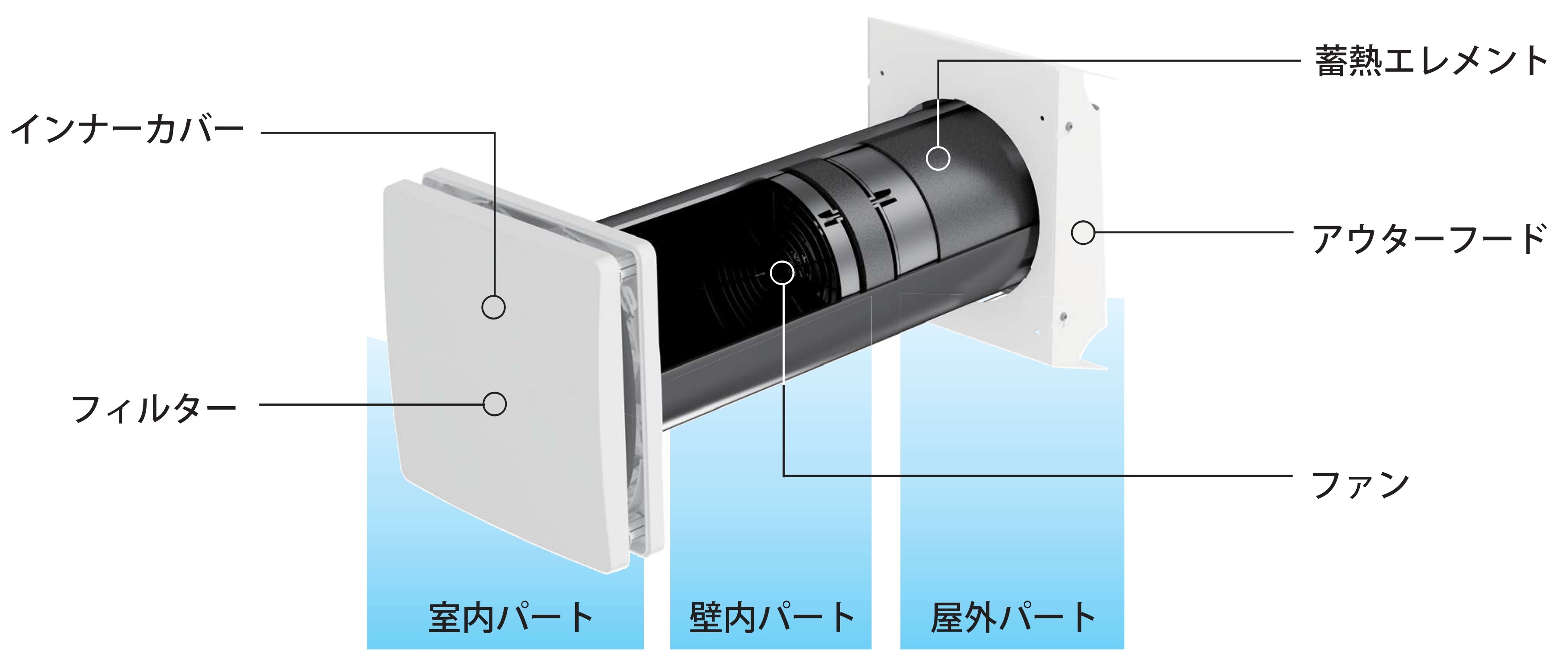 - 室内の温度・湿度を蓄熱エレメントに蓄えながら、汚れた空気を排気します。70秒経つとファンが自動で反転し給排気が切り替わります。 新鮮な空気を給気する際に蓄熱エレメントに蓄えた温度・湿度を室内に戻してくれる換気扇です。