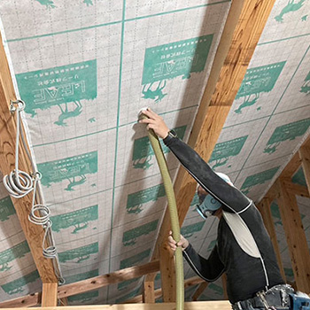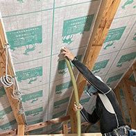 セルロースファイバーは断熱・調湿・吸音・防音・難燃・防虫・防カビを全て叶えます。密度55kg/m³の施工で隙間なく断熱します。高性能な断熱材であると同時に、「自然素材の家」に最適な素材です。湿気を吸って終わりではなく、乾いて戻ることまで含めて設計してこそ、その真価を発揮します。