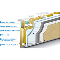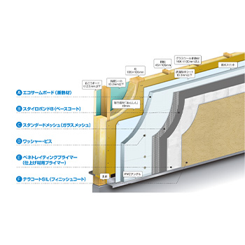 EPS断熱材を、専用のベースコートと特殊メッシュで補強し左官(塗り壁)で仕上げるシステムです。外断熱なので、住みながら断熱リノベーションすることができます。目地が無いので外壁塗り替えの頻度も少なくできます。躯体を外からすっぽり断熱材で囲むことで熱橋を無くし建物の環境を守るので、夏も冬も快適になります。欧米では50年以上の実績のある一般的な工法で日本でもホテル・学校・老健施設など多くの実績があります。